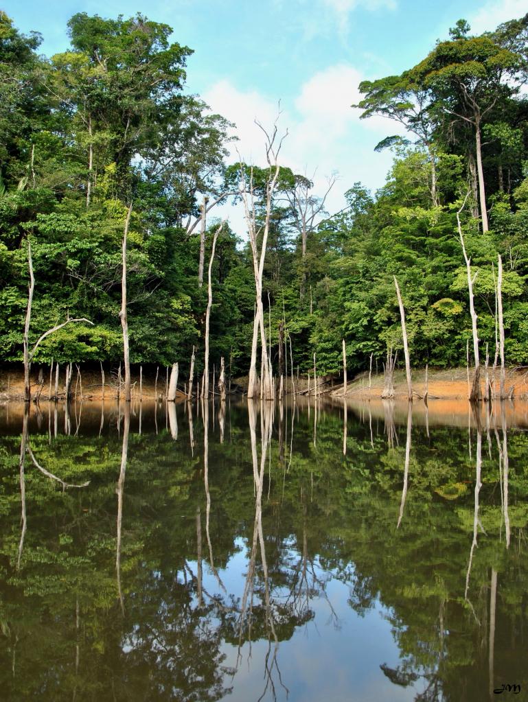 Le lac et la forêt inondée au dessus du barrage hydroélectrique de petit saut, sur le Sinnamary. Remontée jusqu'au saut Takari tenté.